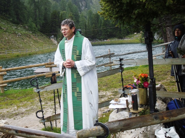 Die Hoffnung auf ein Wolkenloch während der Heiligen Messe blieb uns aber leider verwehrt. Bei denkbar widrigen Witterungsbedingungen – Regen, Wind, Kälte – wurde die Messe trotzdem am Gedenkkreuz von Pater Wildfried Lutz abgehalten. Aber alle „Bergfexen“, mit dabei auch die Geschwister von Pater Lutz, Anton und Margarethe mit ihren Familien, trotzten dem Wetter und lauschten andächtig den Worten von Blindenseelsorger, Pfarrer Franz Lindorfer.