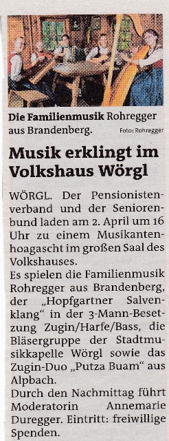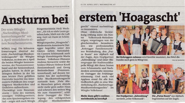 Am Sonntag, den 02. April 2017, fand im Volkshaus in Wörgl ein Musikantenhoagascht statt. Mit dabei waren die „Putza Buam“ aus Alpbach, der „Hopfgartner Salvenklang“, eine Bläsergruppe der Stadtmusikkapelle Wörgl und wir, die Familienmusik Rohregger. Durch den „Hoagascht“ führte Annemarie Duregger….