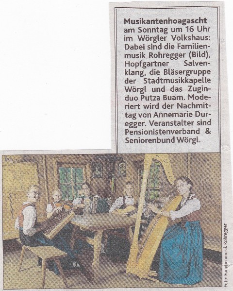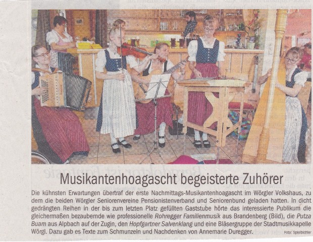 Die kühnsten Erwartungen übertraf der erste Nachmittags-Musikantenhoagascht im Wörgler Volkshaus, zu dem die beiden Wörgler Seniorenvereine Pensionistenverbad und Seniorenbund geladen hatten. In dicht gedrängten Reihen in der bis zum letzten Platz gefüllten Gaststube hörte das interessierte Publikum die gleichermaßen bezaubernde wie professionelle Rohregger Familienmusik aus Brandenberg (Bild), die Putza Buam aus Alpbach auf der Zugin, den Hopfgartner Salvenklang und eine Bläsergruppe der Stadtmusikkapelle Wörgl. Dazu gab es Texte zum Schmunzeln und Nachdenken von Annemarie Duregger.“