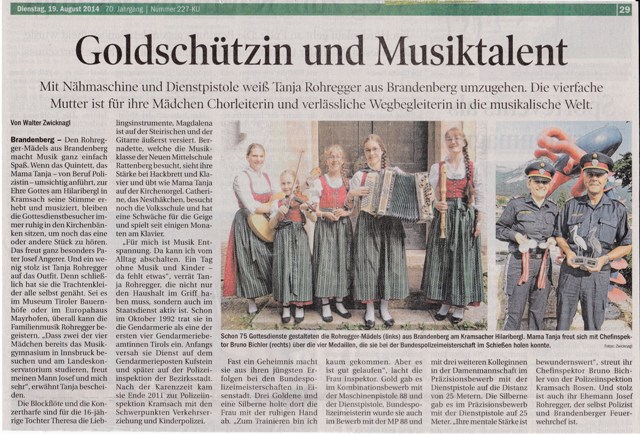 „Brandenberg – Den Rohregger-Mädels aus Brandenberg macht Musik ganz einfach Spaß. Wenn das Quintett, das Mama Tanja – von Beruf Polizistin – umsichtig anführt, zur Ehre Gottes am Hilaribergl in Kramsach seine Stimme erhebt und musiziert, bleiben die Gottesdienstbesucher immer ruhig in den Kirchenbänken sitzen, um noch das eine oder andere Stück zu hören. Das freut ganz besonders Pater Josef Angerer. Und ein wenig stolz ist Tanja Rohregger auf das Outfit. Denn schließlich hat sie die Trachtenkleider alle selbst genäht. Sei es im Museum Tiroler Bauernhöfe oder im Europahaus in Mayrhofen, überall kann die Familienmusik Rohregger begeistern. „Dass zwei der vier Mädchen bereits das Musikgymnasium in Innsbruck besuchen und am Landeskonservatorium studieren, freut meinen Mann Josef und mich sehr“, erwähnt Tanja bescheiden.