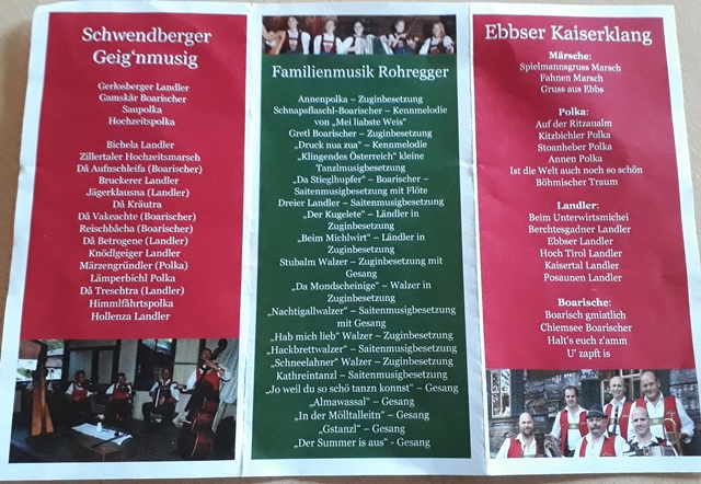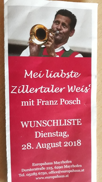 Am 28. August 2018 spielten wir bei der „Mei liabsten Zillertaler Weis‘ “ mit Franz Posch, dem Ebbser Kaiserklang und der Schwendberger Geig’nmusig im Europahaus in Mayrhofen.
