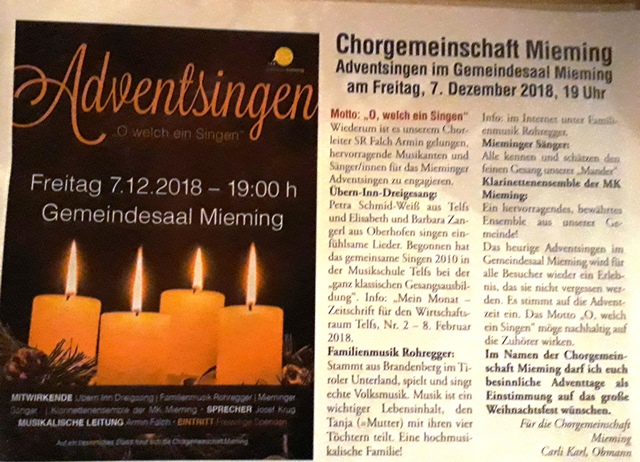 Am 7. Dezember veranstaltete die Chorgemeinschaft Mieming unter der Leitung von Armin Falch ein Adventsingen im Gemeindesaal in Mieming…..