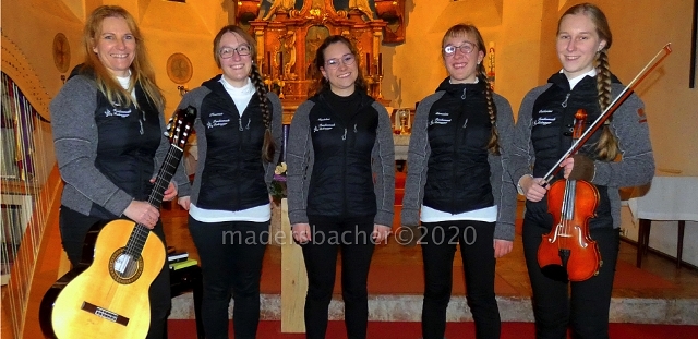 Familienmusik Rohregger, das sind: Tanja Rohregger Leitung der Familienmusik (Gitarre), Magdalena Kpm BMK Mariatal (Trompete, Steirische, Gitarre), Theresa Kpm-Stv BMK Mariatal (Harfe, Flöten aller Art, Klarinette), Bernadette (Hackbrett) und Catherina (Geige).
