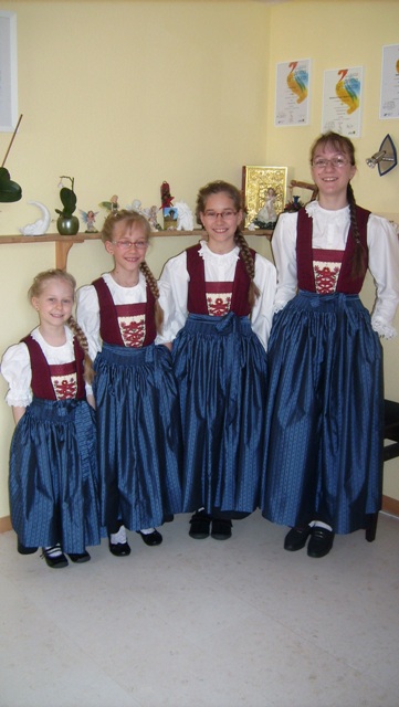 Da sich Mama im Dezember 2009 selbst eine Tracht genäht hat, wollte sie auch für uns Kinder eine Tracht anfertigen. Dafür hat sie viele Nächte genäht und gestickt – wir Kinder durften immer wieder probieren und freuten uns, als aus den vielen einzelnen Stoffteilen endlich Kleider wurden!