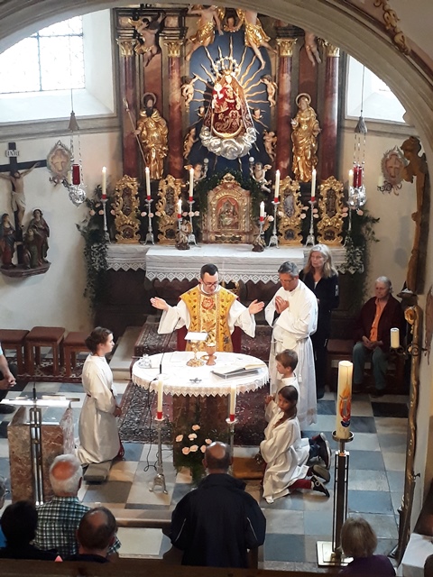 Bei leichtem Regen wanderten wir am frühen Nachmittag von Strass im Zillertal mit einem Teil unserer Instrumente (die Harfe ließen wir zuhause!) auf die Wallfahrtskirche Maria Brettfall. Dort umrahmten wir die Heilige Messe, zelebriert vom Primizianten Fritz Kerschbaumer und Herrn Pfarrer Mag. Bernhard Kopp musikalisch.