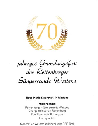 Am Samstag, den 04. Juni 2016 feierte die Rettenberger Sängerrunde im „Haus Marie Swarovski“ in Wattens ihr 70 jähriges Gründungsfest….