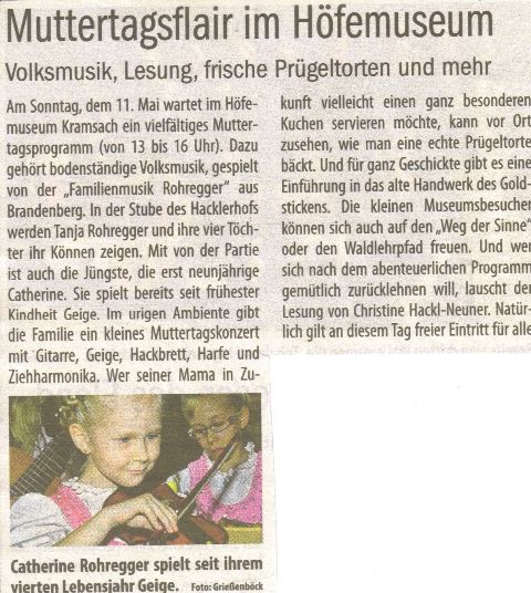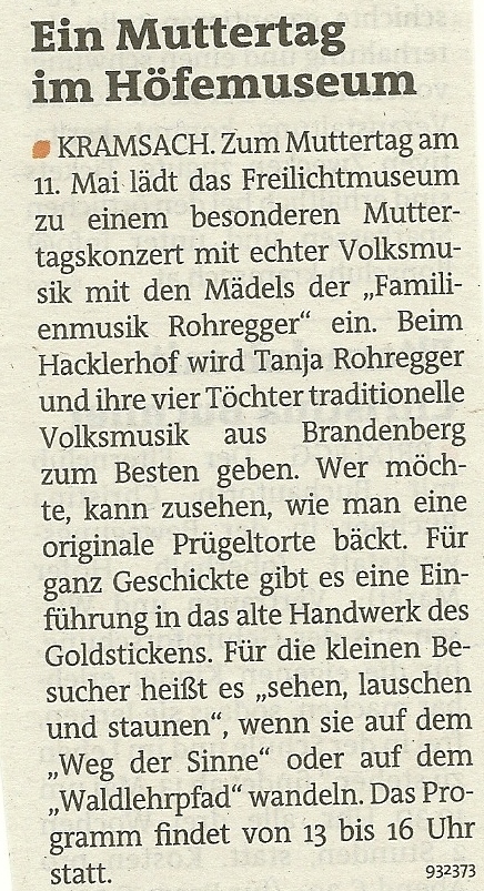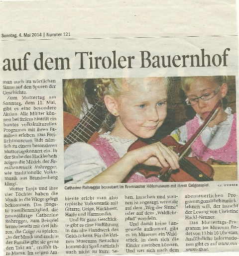 „… man auch im wörtlichen Sinne auf den Spuren der Geschichte. Zum Muttertag am Sonntag, dem 11. Mai, gibt es eine besondere Aktion. Alle Mütter können bei freiem Eintritt ein buntes volkskulturelles Programm mit ihren Familien erleben. Das Freilichtmuseum lädt nämlich zu einem besonderen Muttertagskonzert ein. In der Stube des Hacklerhofs zeigen die Mädels der Familienmusik Rohregger, wie traditionelle Volksmusik aus Brandenberg klingt. Mutter Tanja und ihre vier Töchter haben die Musik in die Wiege gelegt bekommen. Das jüngste Familienmitglied, die neunjährige Catherine Rohregger, zum Beispiel lernte bereits mit drei Jahren, die Geige zu spielen. ‚In der Musik und auch in der der Familie gibt sie gerne den Takt an‘, erzählt ihre Mama. Im urigen Ambiente erlebt man also typische Volksmusik mit Gitarre, Geige, Hackbrett, Harfe und Harmonika. Und für ganz Geschickte gibt es eine Einführung in das alte Handwerk des Goldstickens. Für die kleinen Museums-Besucher kommt der Spaß natürlich auch nicht zu kurz. Sehen, lauschen und staunen ist angesagt, wenn sie auf dem ‚Weg der Sinne‘ oder auf dem ‚Waldlehrpfad‘ wandeln. Und damit keine Langeweile aufkommt, gibt es im Museum ein Waldstück, in dem sich die Kinder austoben können. Und wer sich nach dem abenteuerlichen Programm gemütlich zurücklehnen will, der lauscht der Lesung von Christine Hackl-Neuner. Das Muttertags-Programm im Museum findet von 13 bis 16 Uhr statt. Ausführliche Informationen gibt es auf www.museum-tb.at.“ Text: Hubert Trenkwalder, TT