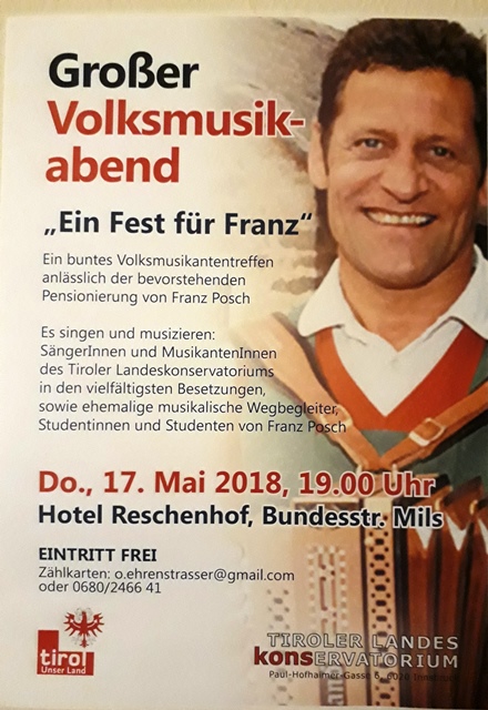Am 17. Mai 2018 fand „Ein Fest für Franz“ zu Ehren und Verabschiedung von Dr. Franz Posch nach seiner langjährigen Lehrtätigkeit am Tiroler Landeskonservatorium im Reschenhof in Mils statt…..