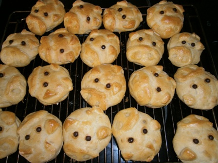 Aus dem Teig werden Schweinchen geformt und gebacken.