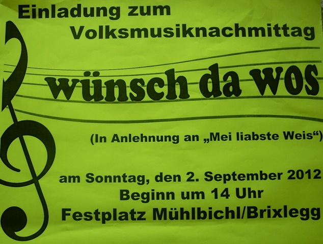 Am Sonntag, den 02. September 2012 fand beim Festplatz Mühlbichl in Brixlegg, veranstaltet von der Marktmusikkapelle Brixlegg, ein Volksmusiknachmittag unter dem Motto „WÜNSCH´ DA WOS“ (angelehnt an die „Mei liabste Weis“ bekannt aus dem ORF mit Franz Posch) statt…..